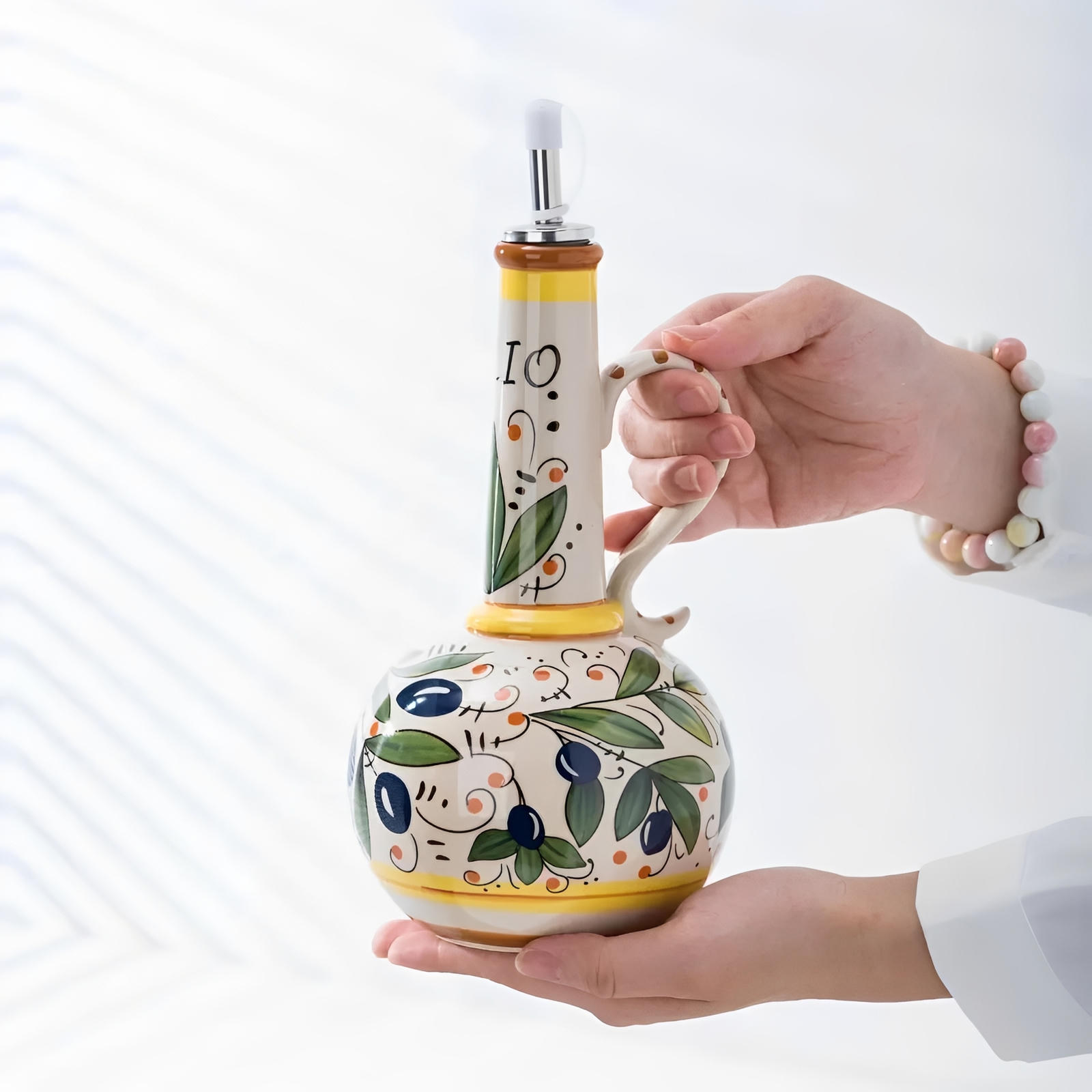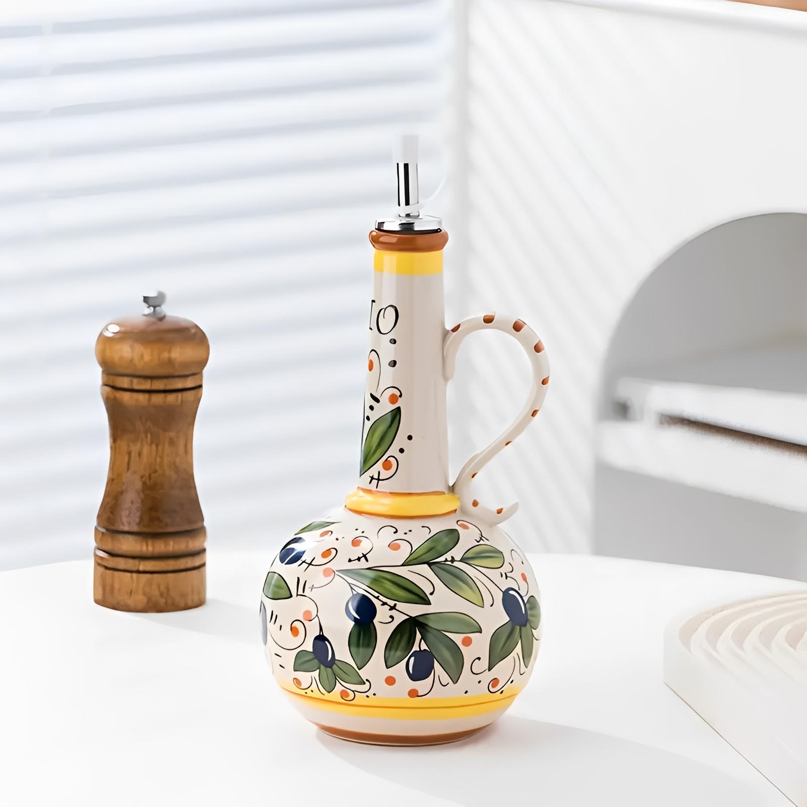 Store and pour your favorite oil with this hefty high-style dispenser featuring a stainless steel spout and a bulbous base with a classic narrow neck. With its vibrant display of hand-painted floral motifs, this bottle captures the essence of traditional Tuscan design, making it a standout addition in any kitchen.