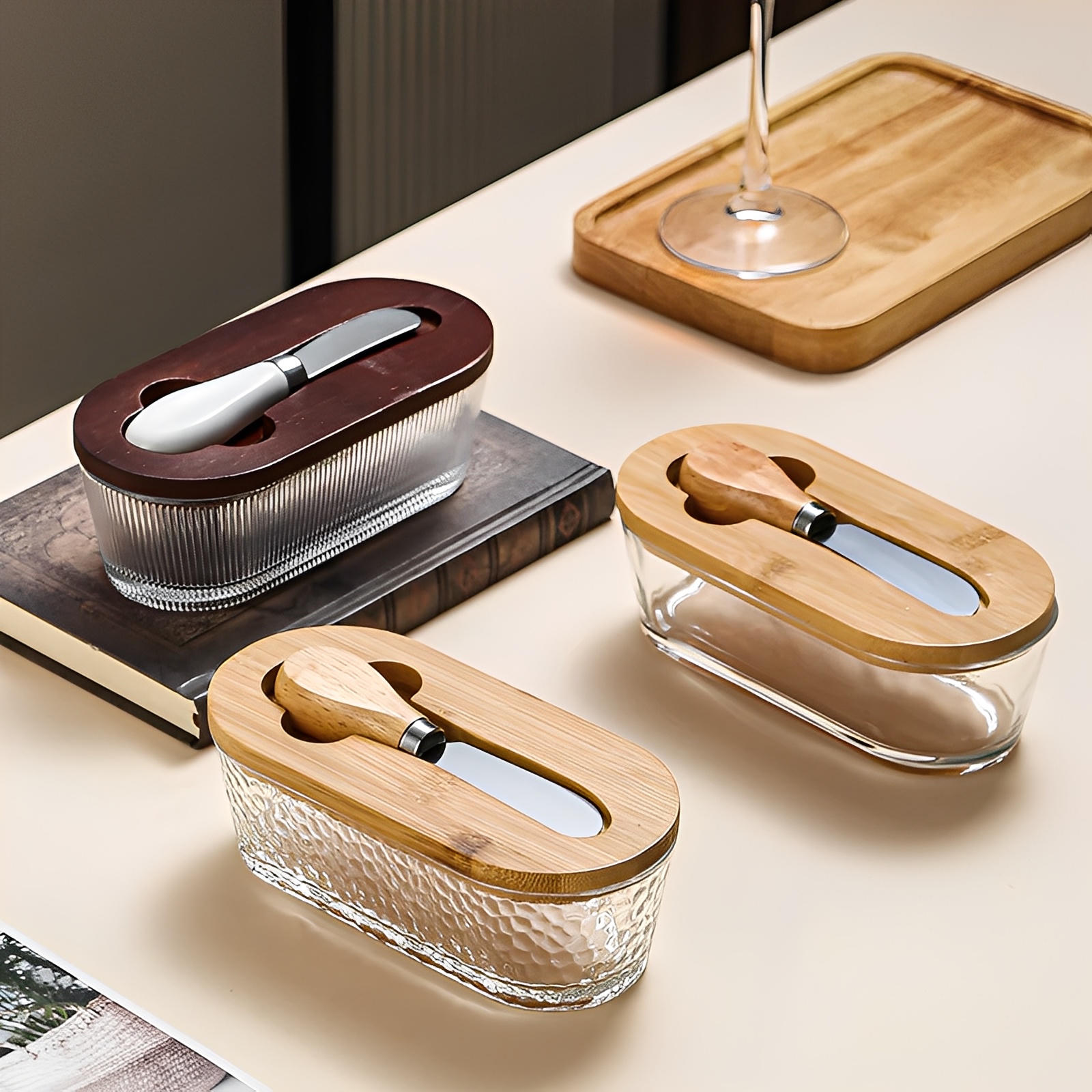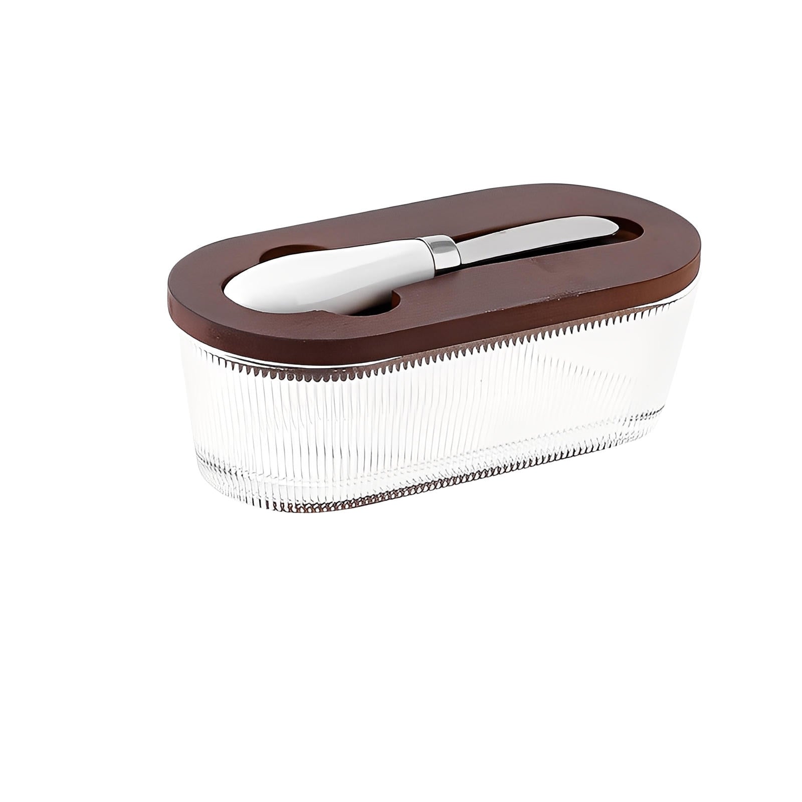 A sleek combination of natural wood and clear glass highlights the smooth design of this butter dish. The textured glass base adds visual intrigue, while the carved lid cradles the butter knife for easy access—keeping butter and spreader neatly in one place.