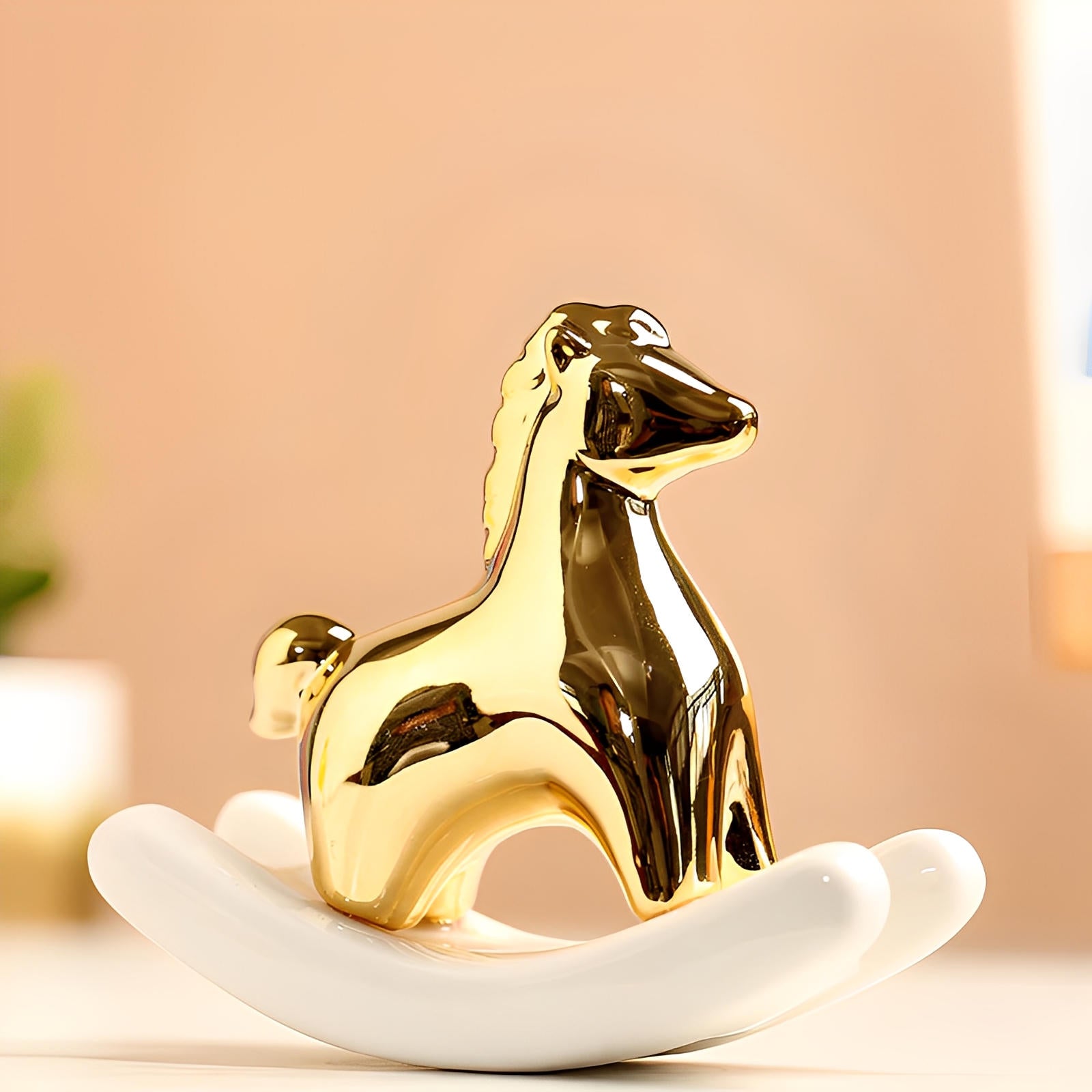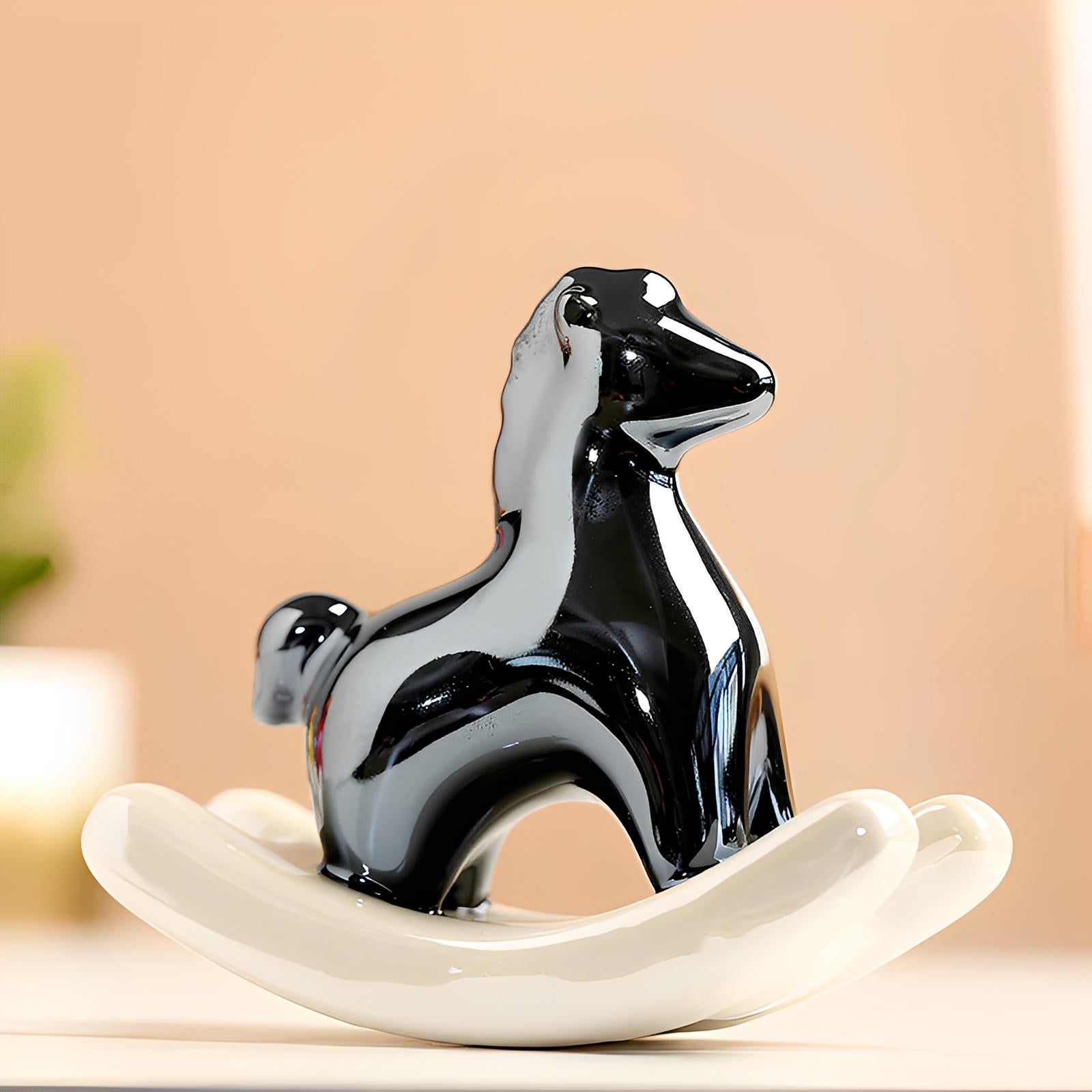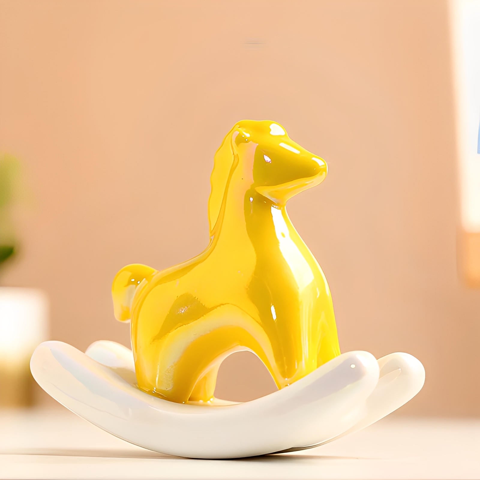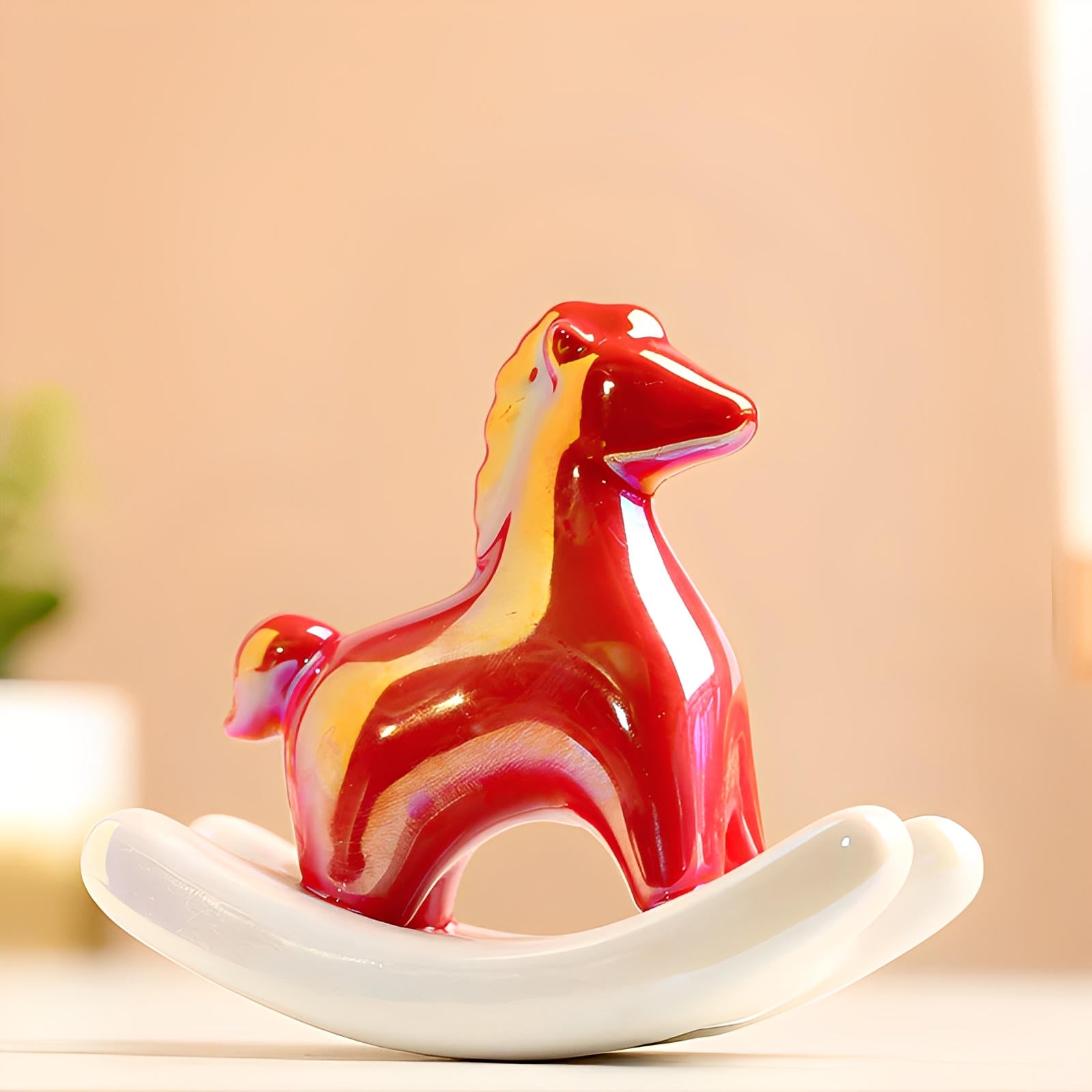 Glossy ceramic ponies capture the feel of childhood nostalgia, with their mirror-like coating catching the light in vibrant tones. Minimalistic yet super fun, each one rests on a smooth, rounded rocking base that adds gentle rhythm and intrigue to any space.