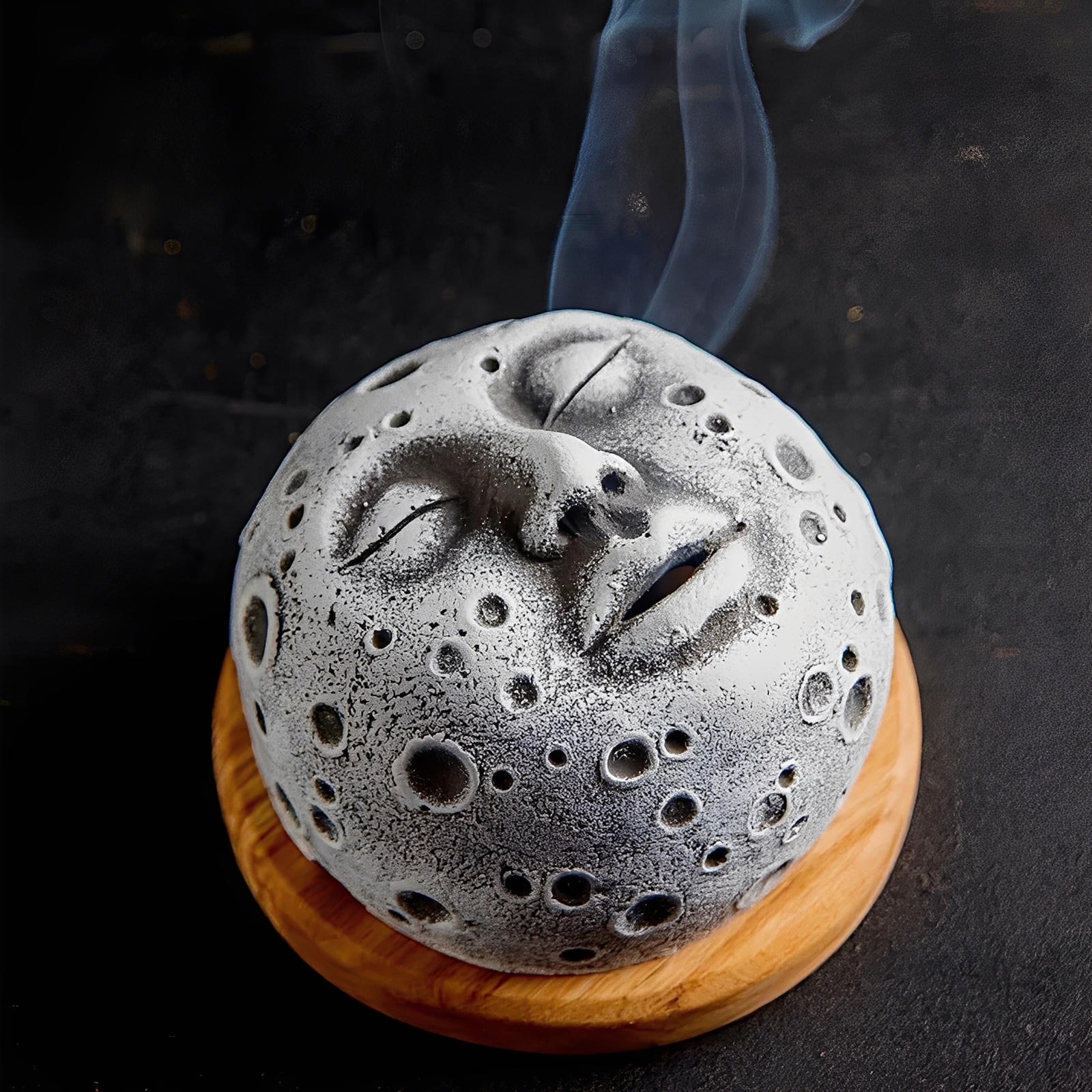 Textured resin mimics the moon’s rugged surface with deep craters and ridges. Resting on a natural ashwood base, it releases a soft trail of smoke, like a quiet exhale from the cosmos—doubling as both an incense burner and a sculptural art piece.